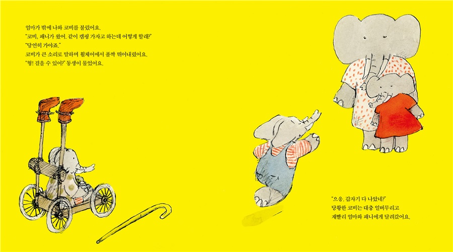아빠와 동생, 그리고 막내와 함께 산책을 나왔다가 느닷없이 다리가 아프게 된 코비. 사실 코비는 걷기 싫어 유모차를 타고 싶었지만 아빠는 안 된다며, 못 걷겠으면 혼자 집으로 가라고 한다. 유모차를 타지 못하게 하는 것도 서운한데 혼자 돌아가라니? 아빠의 이런 태도 때문에 코비는 당혹스럽다. 그림에 나타난 표정과 눈빛을 보면 코비가 얼마나 당황스러운지 한눈에 알 수 있다.