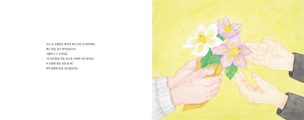 오랫동안 병석에 계신 다른 수녀님은 감자꽃을 선물 받고 “어쩜 이리 곱지요? 이 도톰한 꽃술 모양 좀 봐.”하며 불편한 몸을 일으킵니다.