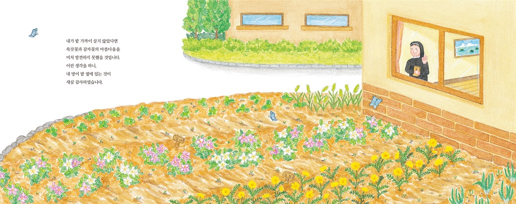 정원에 핀 장미, 수국, 달리아, 글라디올러스와 같은 화려한 꽃들도 좋지만 노란 쑥갓꽃과 흰빛, 보랏빛의 감자꽃, 채소들이 피운 꽃들은 그 소박한 아름다움으로 수녀님들에게 기쁨을 안겨 드립니다.