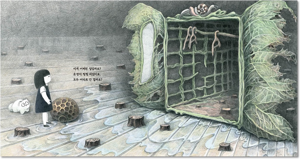 섬세한 선으로 그려 낸 나무와 동물들 모습이 쉽게 훼손될 수 있는 자연의 섬세함을 잘 표현하고 있다. 마치 가우디가 디자인한 옷장을 보는 듯한 옷장과 온갖 옷들이 시선을 사로잡는다. 훼손된 옷장은 아름답던 자연이 훼손되면 얼마나 끔찍한 모습이 될 수 있는지를 확인하게 해 줍니다.