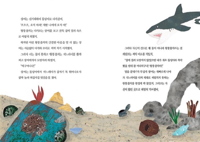 톡 쏘는 독을 가진 투명 해파리, 해초를 쏙 빼닮은 유령실고기, 껍데기 집을 이고 다니는 소라게, 돌멩이와 구별이 안 가는 왕퉁쏠치…. 모두 한가락씩 하는 바다 생물들이 모여 자기 자랑을 하다 싸움이 벌어졌어요. 톡 쏘는 독침과 날카로운 집게발에 서로가 다칠 수도 있는 위기의 순간, 여덟 개의 다리를 자유자재로 쓸 수 있는 흉내문어 덕분에 싸움은 진정됩니다. 하지만 무시무시한 이빨을 가진 상어가 나타나자 모두 혼비백산 달아나지만, 왕퉁쏠치가 상어에게 물려가요. 다음에 배고픈 상어가 다시 나타나면 어떻게 해야 할까요? 바다 생물들의 걱정이 이만저만이 아니에요. 다행히 변신의 천재인 흉내문어의 조언에 따라 모두 주변의 바다 쓰레기로 변신하는 기술을 터득하지요. 무시무시한 상어가 다시 나타났지만, 모두 쓰레기로 변신한 덕분에 위기를 모면합니다. 하지만 그 순간…, 물 위에서 내려온 커다란 그물이 바다 생물들을 덮치고, 쓰레기로 변신한 바다 생물들은 배 위로 끌어올려지지요. 준영이와 찬영이의 그물에 잡힌 바다 생물들의 운명은 어떻게 될까요? 변신 물고기들의 ‘우당탕탕’ 모험 이야기가 펼쳐집니다.