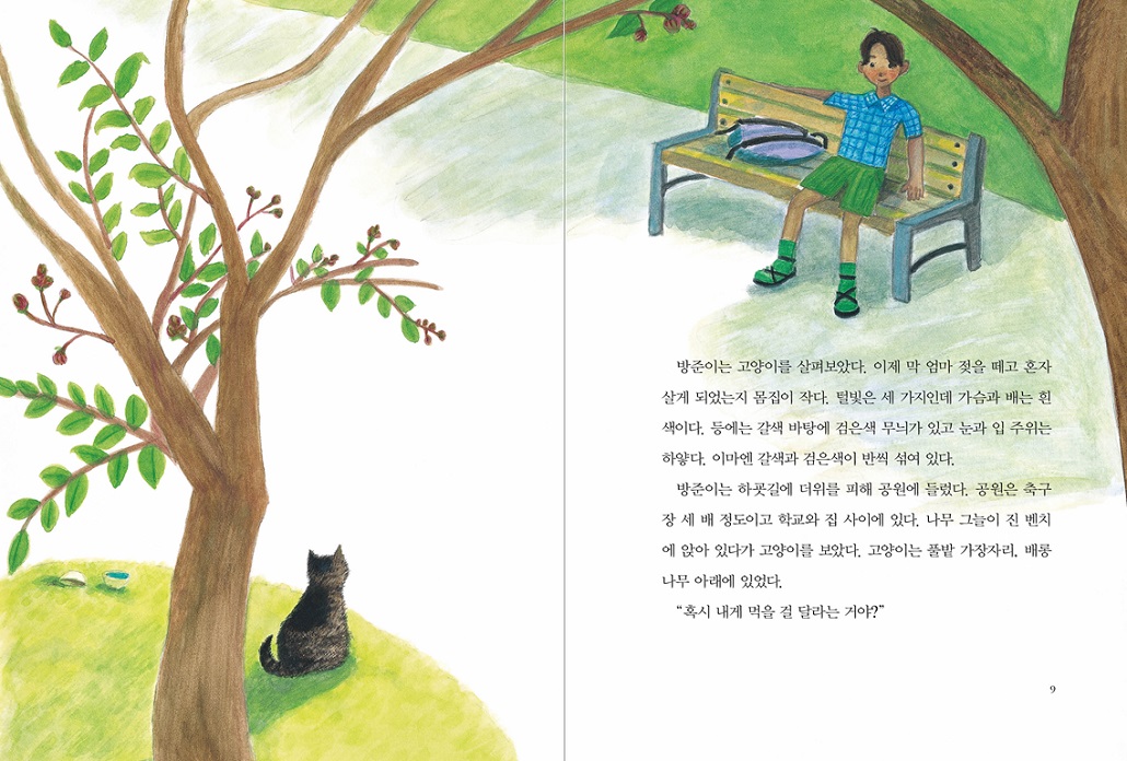 방준이는 하굣길에 더위를 피해 공원에 들렀다. 공원은 축구장 세 배 정도이고 학교와 집 사이에 있다. 나무 그늘이 진 벤치에 앉아 있다가 고양이를 보았다. 고양이는 풀밭 가장자리, 배롱나무 아래에 있었다.