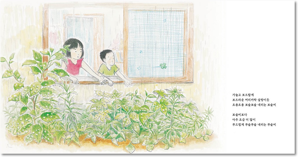 우리 조상님들은 비가 내리는 모양, 굵기, 세기, 시기, 시간, 분량, 동반하는 환경 변화에 따른 특징에 따라 다양한 이름으로 불렀습니다. 그러한 특성을 어린이들 정서를 고려한 언어와 음율, 시각을 통해 쉽고 친근하게 경험할 수 있도록 비 오는 날 오누이와 아이들이 빗속에서 하는 여러 가지 모습을 아름다운 그림으로 보여 주기 위해 애썼습니다.