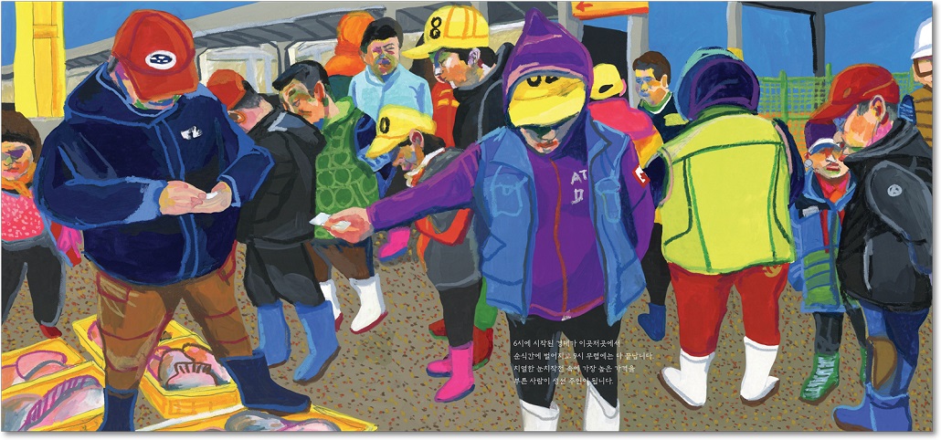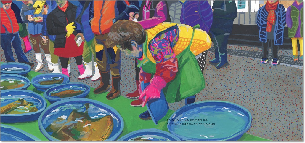 붓으로 그린 거친 선 아래 항구에서 살아가는 사람들의 기운이 살아난다. 경매사의 리드미컬한 음성이 들리고 그 긴장이 그대로 전달된다. 펄떡이며 생명력을 자랑하는 생선들의 생생함과 비릿한 바다 내음도 풍겨 온다. 움직임이 잡히는 듯 역동적인 선과 대담한 색감에 감탄하게 된다.