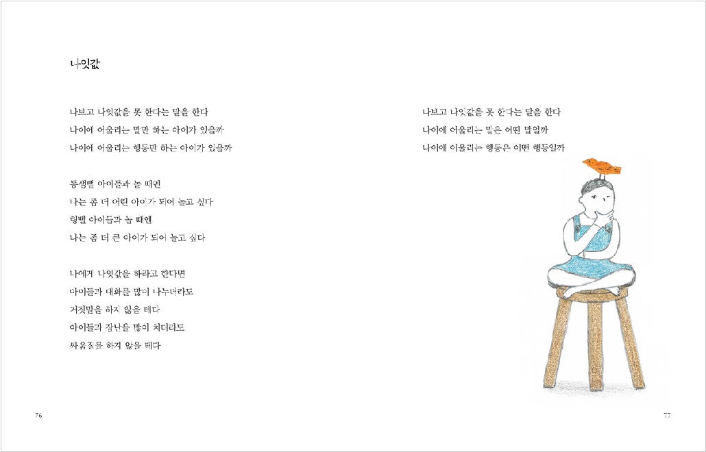 ‘나잇값’에서는 나이에 상관없이 나잇값이라고 하는 것은 무엇일까 하는 생각을 하게 만들고, ‘나이에 어울리는 행동을 어떤 행동일까’를 생각하게 만드는 시입니다.