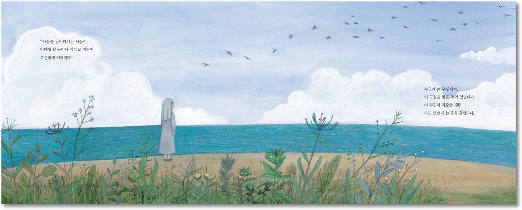 가만히 하늘을 바라보다 떼 지어 날아가는 새들을 보게 됩니다. 그리고 새들은 쉴 곳이 제대로나 있는지 궁금해지다가 눈물짓습니다. 이렇게 새에게 한 걸음 다가갑니다.