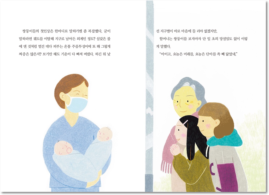 쌍둥이들의 첫인상은 한마디로 말하기엔 좀 복잡했다. 굳이 말하라면 궤도를 이탈해 지구로 날아든 외계인 정도? 살갗은 불에 덴 것처럼 벌건 데다 피부는 온통 주름투성이에 또 왜 그렇게 짜증은 많은지? 보기만 해도 기운이 다 빠져 버렸다. 하긴 뭐 낯선 지구별이 바로 마음에 들 리야 없겠지만.