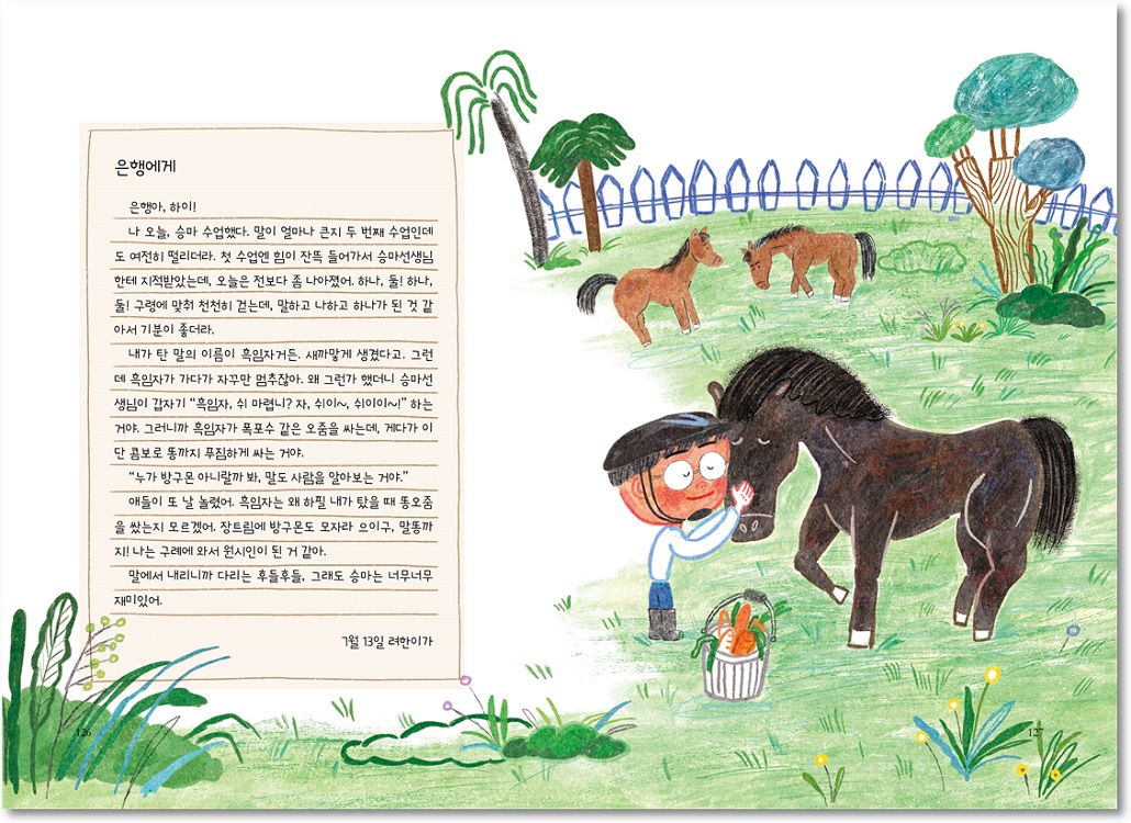 나 오늘, 승마 수업했다. 말이 얼마나 큰지 두 번째 수업인데 도 여전히 떨리더라. 첫 수업엔 힘이 잔뜩 들어가서 승마선생님한테 지적받았는데, 오늘은 전보다 좀 나아졌어. 하나, 둘! 하나, 둘! 구령에 맞춰 천천히 걷는데, 말하고 나하고 하나가 된 것 같아서 기분이 좋더라.