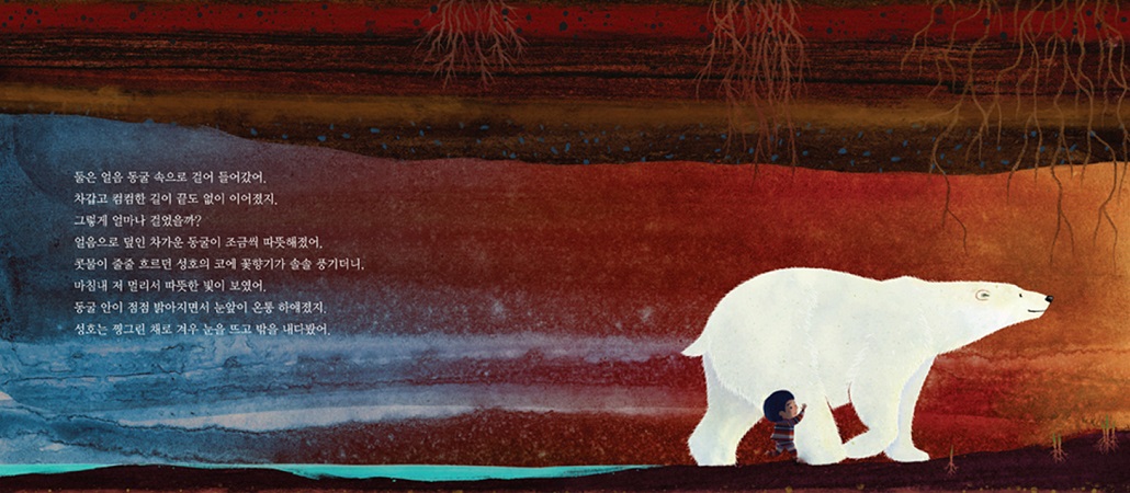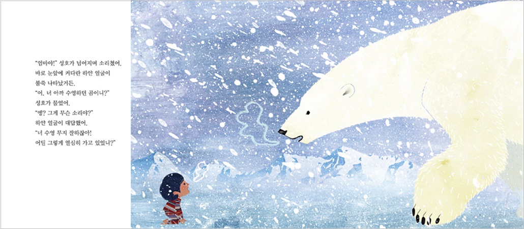 북극곰이 데려간 그곳에는 이제껏 성호가 한 번도 보지 못한 신기한 동물들이 살고 있었다. 처음 보는 동물들을 보고 겁이 난 성호를 가장 먼저 반겨 준 것은 호랑이 줄무늬를 가진 늑대. 어느새 성호는 바위처럼 튼튼한 다리를 가진 새와 신 나게 달리고, 돼지발을 신은 왕쥐들과 물장난을 하고, 집채만 한 물개와 헤엄을 치면서 아름다운 그곳에서 마음껏 뛰어논다. 하지만 모든 모험에는 끝이 있는 법. 빨갛게 노을이 지자 성호는 북극곰과 함께 집으로 돌아온다. 북극곰의 등 위에 엎드린 성호는 몸이 따스해지면서 포근함을 느낀다. 아마도 마지막장에 보이는 것처럼, 이제 막 일을 마치고 돌아온 엄마의 따스한 손길을 성호도 느꼈기 때문일 것이다.