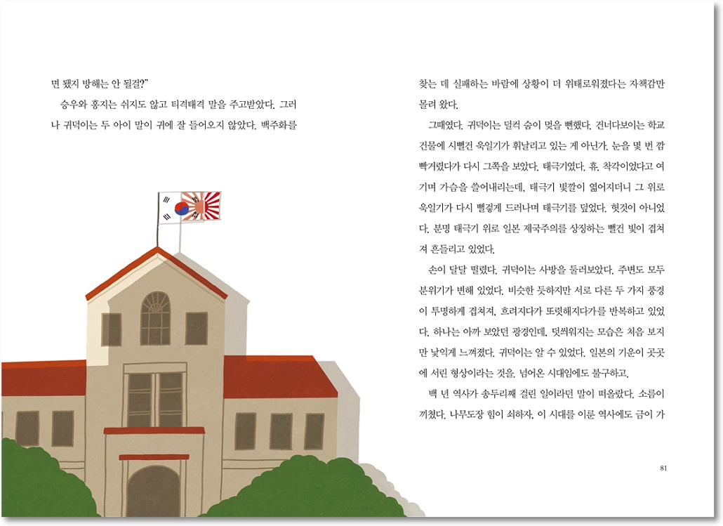 그때였다. 귀덕이는 덜컥 숨이 멎을 뻔했다. 건너다보이는 학교 건물에 시뻘건 욱일기가 휘날리고 있는 게 아닌가. 눈을 몇 번 깜빡거렸다가 다시 그쪽을 보았다. 태극기였다. 휴. 착각이었다고 여기며 가슴을 쓸어내리는데, 태극기 빛깔이 엷어지더니 그 위로 욱일기가 다시 뻘겋게 드러나며 태극기를 덮었다. 헛것이 아니었다. 분명 태극기 위로 일본 제국주의를 상징하는 뻘건 빛이 겹쳐져 흔들리고 있었다.