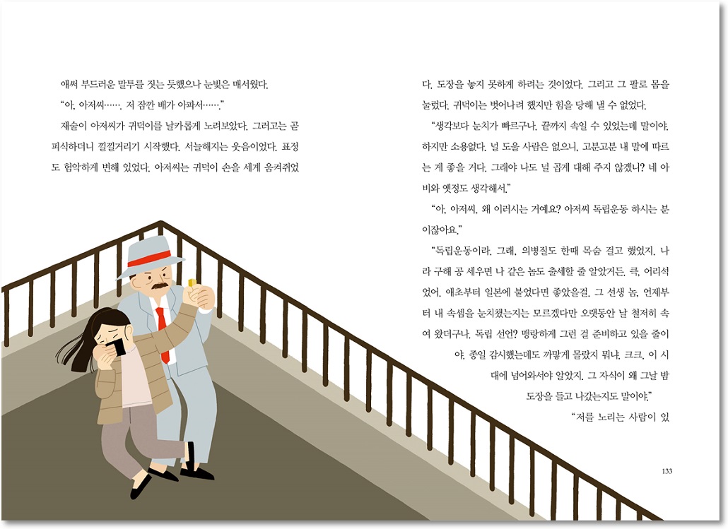 “그렇지만 아저씨, 이곳에서 눈으로 확인하셨잖아요. 봐요, 힘을 모으면 반드시 독립은 이루어져요. 아저씨도 조선인인데, 독립이 되는 걸 알면서 왜 친일을……. 그 벌 어떻게 받으시려……, 읍! 읍!”