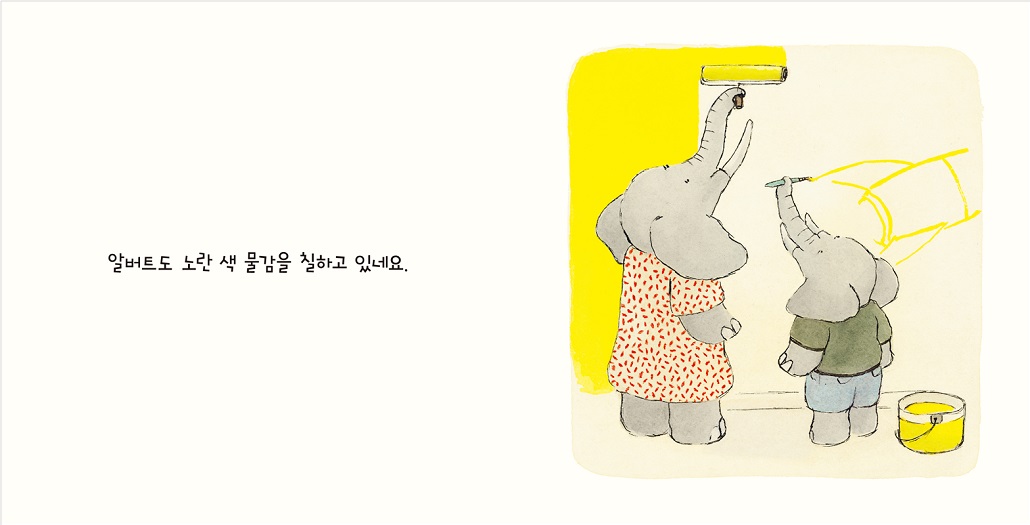 엄마가 벽을 새로 칠하고 있어요. 형은 옆에서 그림을 그리고 있네요. 벽을 새로 칠하는 일을 하면서 아이들이 놀이로 참여할 수 있도록 해 주는 엄마의 교육 태도가 엿보입니다.