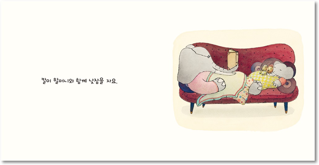 -유아기에 낮잠을 자는 것은 성장에 중요한 일입니다. 이렇게 할머니와 함께 낮잠을 자는 모습으로 성장이 왕성한 어린이와 나이 들어 약해진 노인의 일상을 자연스럽게 연계시켜 보여 주고 있습니다.