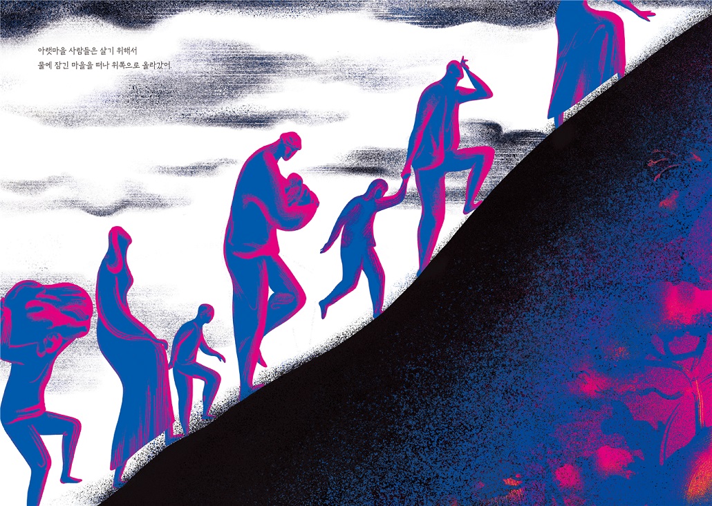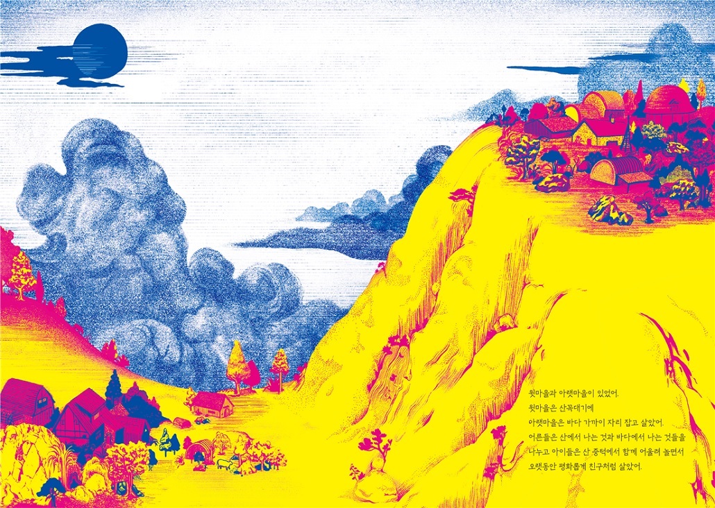 노랑과 빨강의 강렬한 색의 대비와 왼쪽 페이지의 아랫마을, 오른쪽 페이지의 윗마을의 대비가 강렬하다. 화면에 담겨진 방대한 공간이 시야를 크게 확장시킨다.