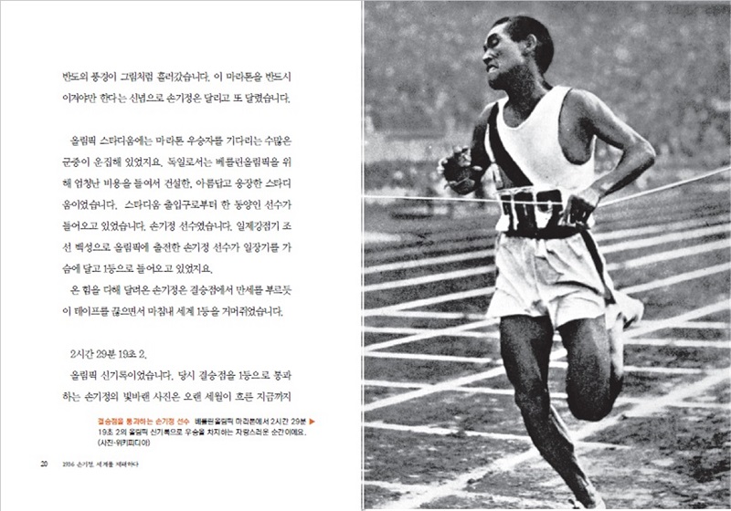 마라톤은 체력적으로 힘겨운 인내와의 싸움입니다. 가난한 압록강변의 소년이 달리기 선수가 되고 일본인의 차별을 견뎌 내면서 베를린올림픽에 진출합니다. 금메달을 따서 세계적 선수가 되었으나 일제강점기였기 때문에 일장기를 달고 우승대에 섰습니다. 조국을 잃어버린 식민지에서 태어난 슬픈 일이었지요. 손기정은 올림픽에서 금메달을 선사함으로써 일제강점기 우리 민족에게 큰 희망을 선사하였습니다.