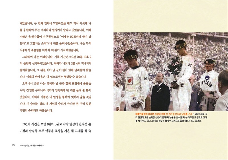 올림픽 선수단을 이끌고 간 일본 대표들도 손기정의 마라톤 우승을 함께 기뻐했지만, 속셈은 달랐지요. 일본인 선수가 아니라 조선인 선수가 우승한 데 대한 질투라고 할까요. 그동안 차별해 온 조선 민족이 우월성을 드러낸 사건이라 일본으로서는 난처한 승리이기도 했습니다. 하여간 손기정은 한국인의 자긍심을 쟁취하고 세계만방에 널리 알리게 됩니다.