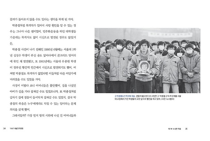 1987년 1월 14일, 남영동 대공분실에 끌려갔던 서울대생 박종철이 경찰의 물고문으로 숨지는 사건이 벌어집니다. “탁자를 ‘탁’ 치니 ‘억’ 하고 쓰러져 죽었다.” 경찰은 어이없는 변명으로 고문치사 사건을 감추려고 했지만, 부검의와 신문기자 등 많은 사람의 노력으로 박종철 고문치사 사건의 진실이 만천하에 드러납니다. 자식을 둔 어머니들을 비롯한 많은 시민이 분노하며 일어섰고, 박종철을 추모하는 집회가 전국에서 열렸습니다. 군사독재 정권의 탄압으로 꽁꽁 얼어붙어 있던 대한민국에 박종철의 죽음이 작은 불씨가 되어 6월민주항쟁의 불길로 번져 갔습니다.