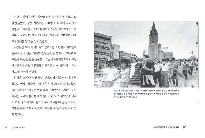 “호헌 철폐!” “독재 타도!” 1987년 6월, 거리를 가득 메운 시민들은 민주주의를 갈망하며 모두 힘을 모아 외쳤어요. 6월민주항쟁으로 우리나라는 민주주의에 한 걸음 더 다가섰어요. 사실 민주주의란 완성형이 아니라 진행형이에요. 한 가지 민주화가 이루어지면 민주화되지 않은 부분이 눈에 띄게 되고, 그럼 다시 민주화를 위해 노력해야 하는 거지요. 그러니 민주주의는 끊임없는 진행형인 셈이지요. 우리가 민주주의를 계속 외쳐야 하는 까닭은 바로 여기에 있어요. 그리고 이것이야말로 1987년 6월민주항쟁의 정신이랍니다.
